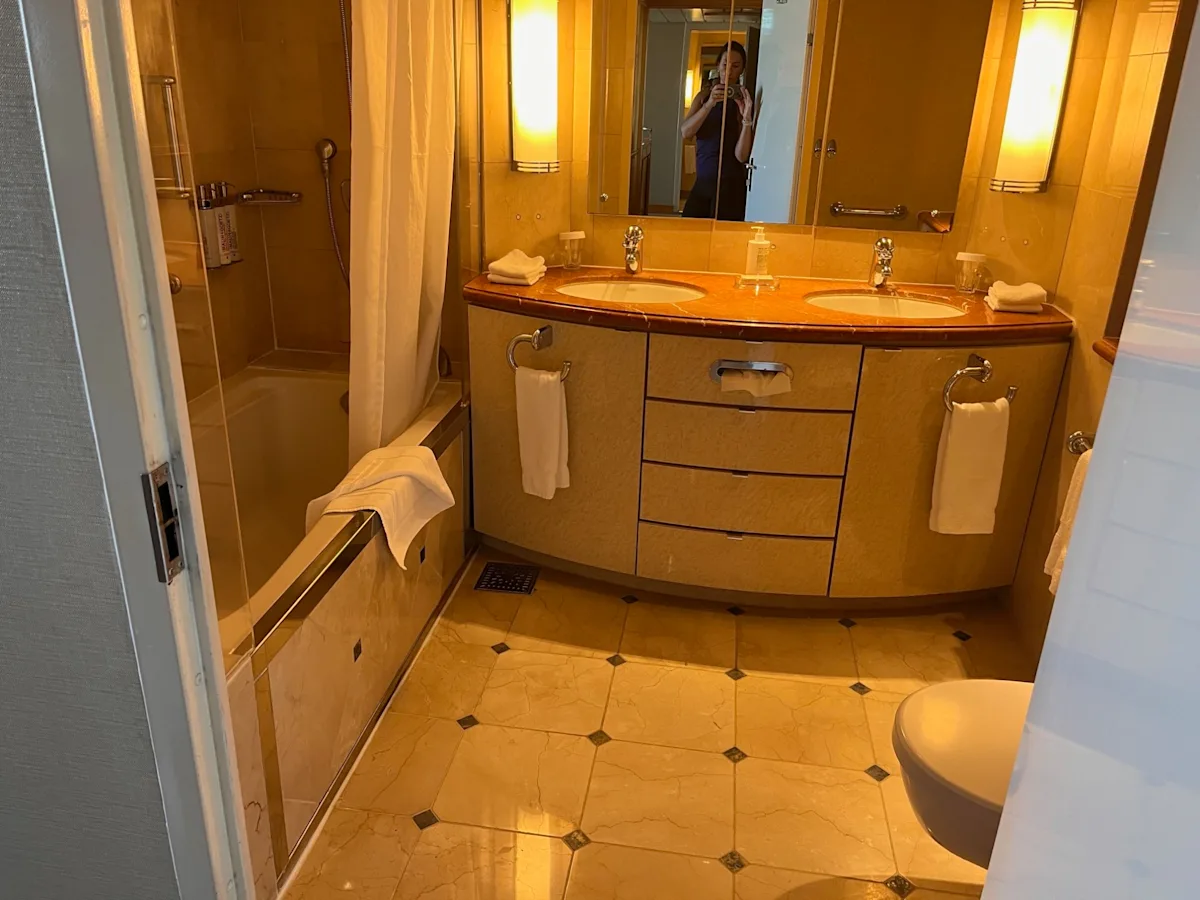 So, for this cruise, my husband and I flew in a day early and stayed at a hotel in Miami. (FYI, we flew into Fort Lauderdale and flew out of Miami. We just happened to find better flights/prices doing that. They are within half an hour of each other, so a viable option if you find a good flight deal!!) We stayed at the Hilton Blue Lagoon Hotel, which is actually VERY close to the Miami airport. It was about a 12-minute Uber ride to the port. We stayed in a corner suite that had a beautiful deck overlooking the pool and Lagoon area. The room was showing its age a little bit, but it was clean and very spacious. There was a separate sitting room, the deck, a very large bedroom, floor to ceiling windows and a bathroom with a separate room for the shower/tub and toilet.