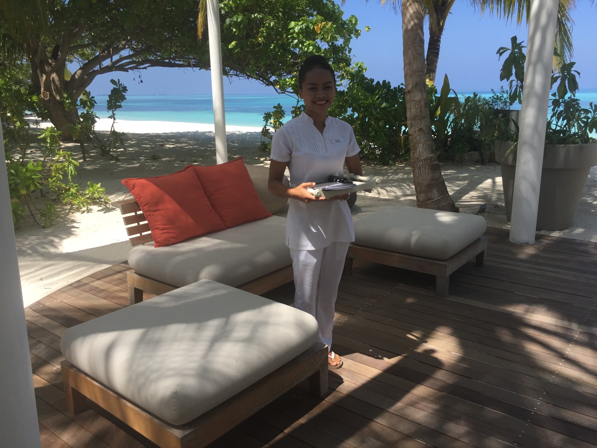 The staff, especially Hassan in Guest Relations and Waheed in housecleaning were exceptional. Highly professional, they have obviously had "5-star" training and it shows. They could not have been any nicer, providing us with complimentary champagne, lovely flower art on the bed and countless small kindnesses including an upgrade to the fabulous water villas with a pool for the last three nights of our stay.