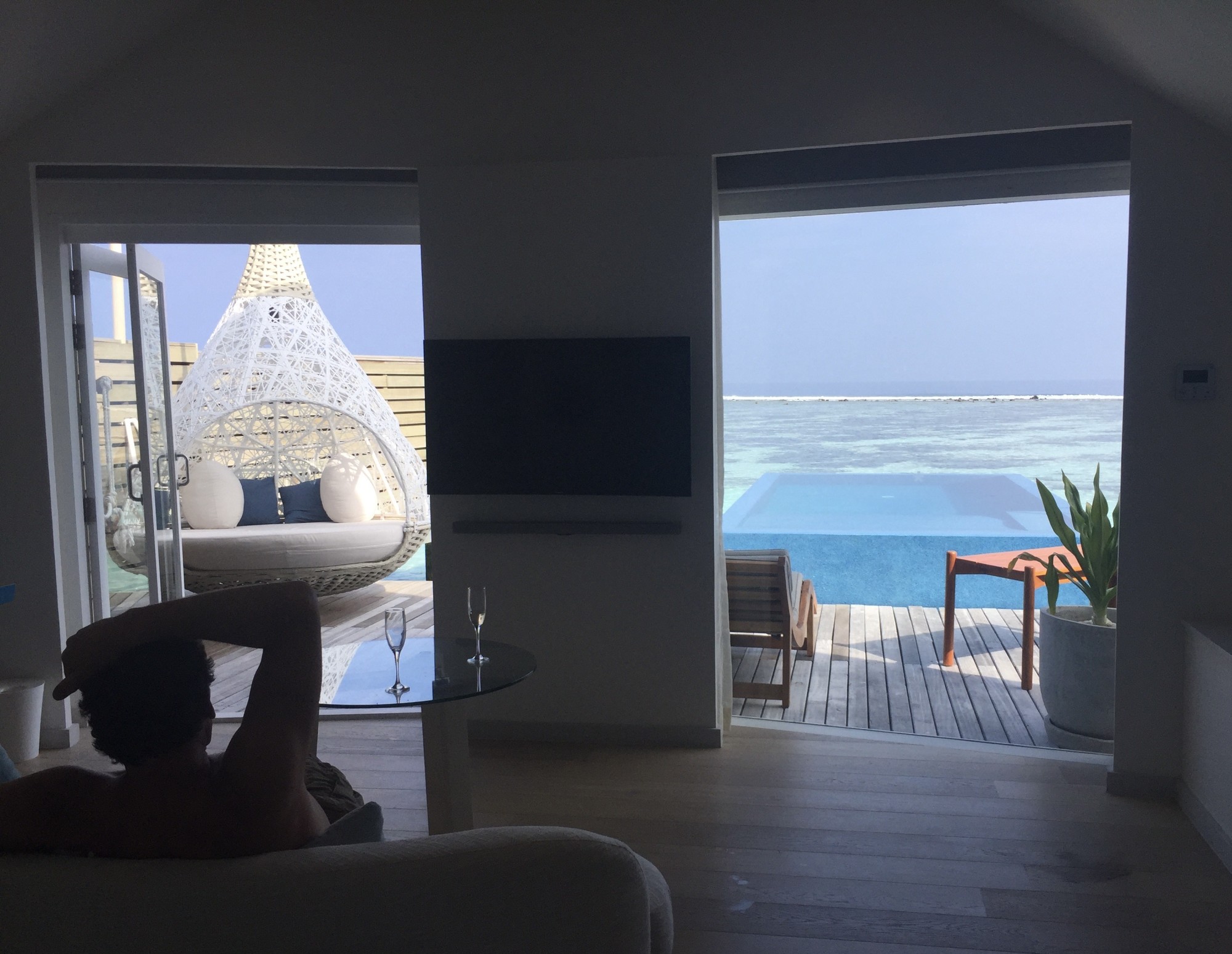 The water villas are exquisite! Our pool was so amazing to sit in at night at hear the waves crashing a short distance away. There is a large round rattan swing that we could both lay in. There is also a comfortable couch as well as two chairs and a table outside. They have thought of everything to make you not even want to leave your room!