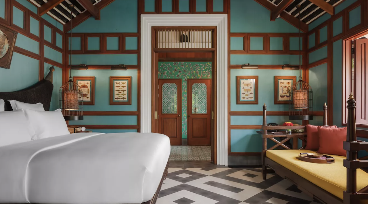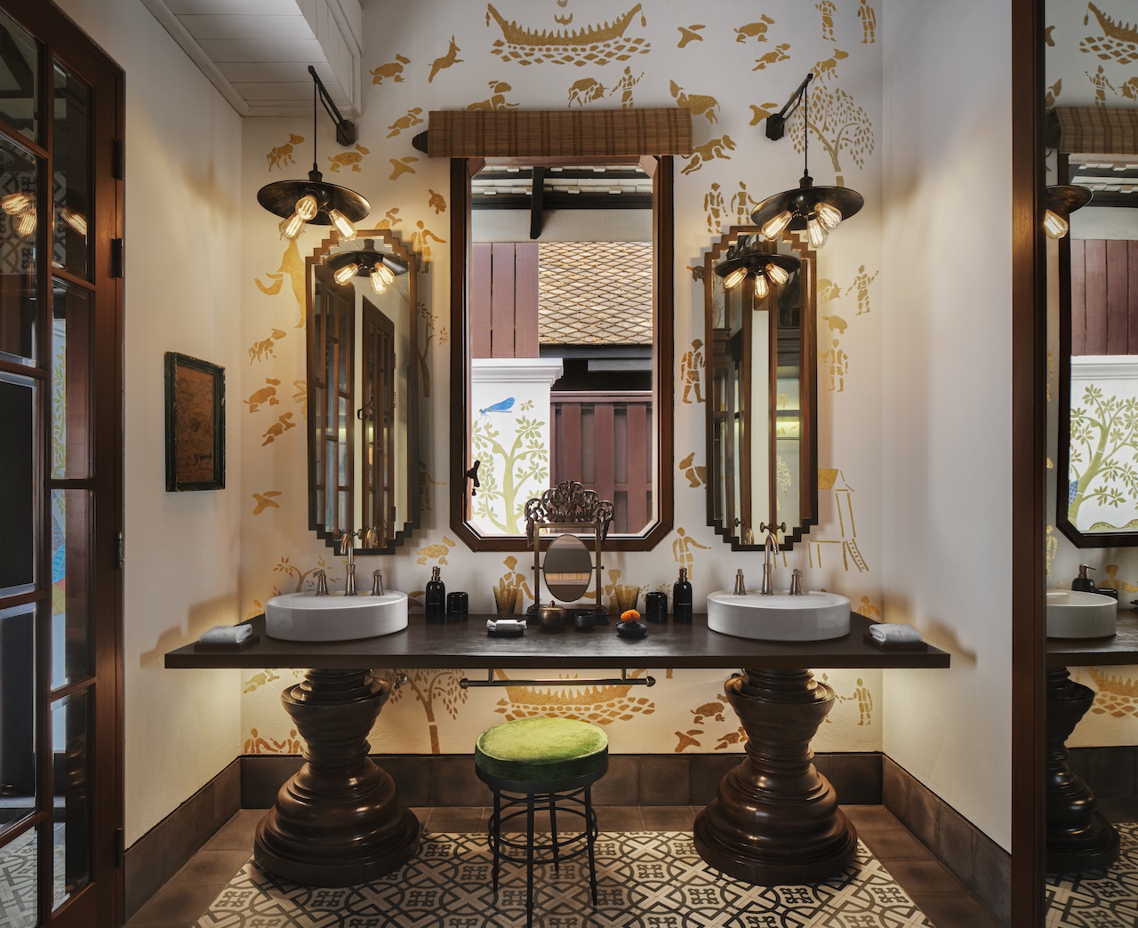 Interiors blending Laotian craftsmanship with colonial aesthetics.