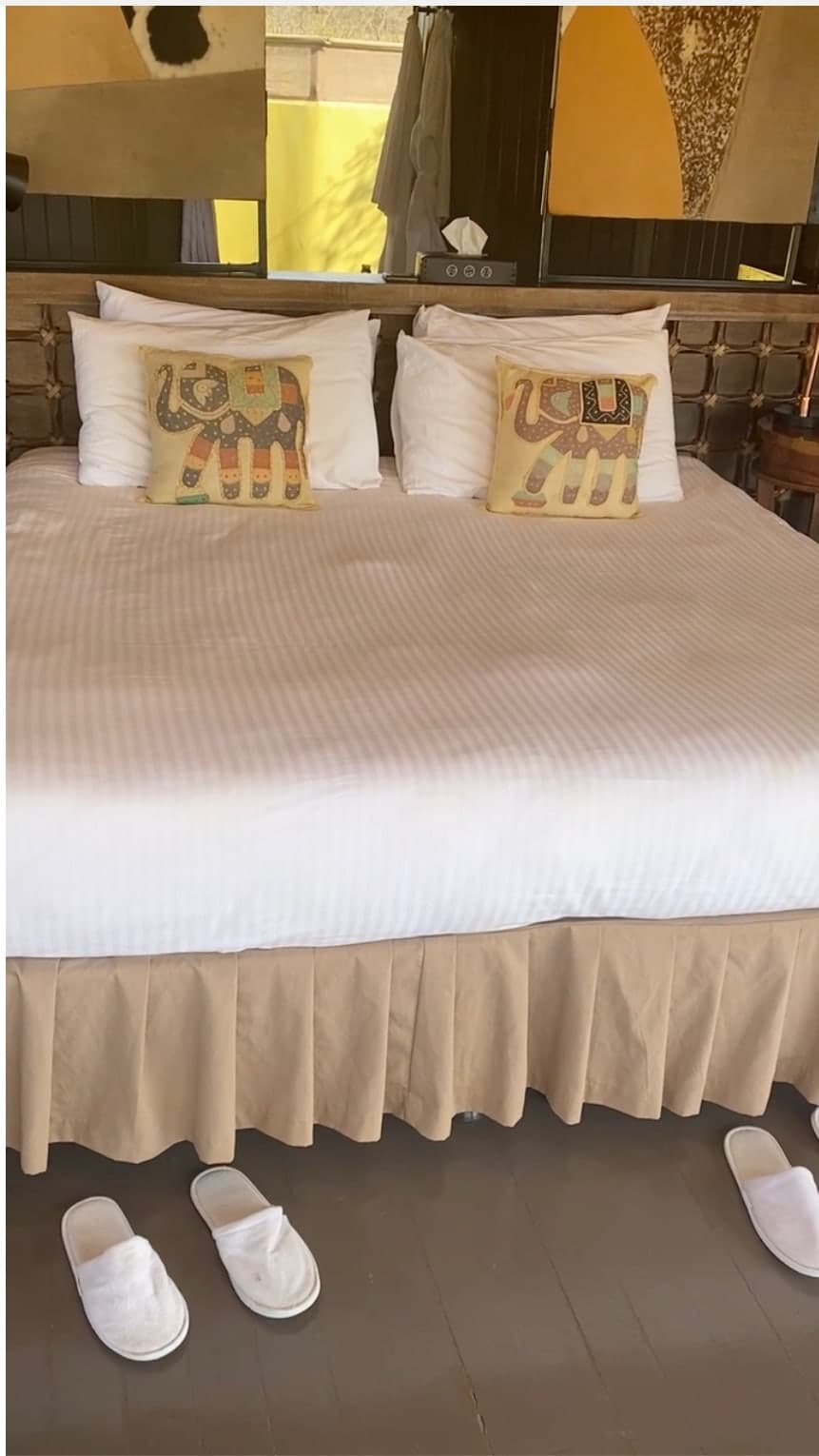 When you get back to the lodge, you must take a minute to spend time on your large deck to exercise like I did. Each bungalow has yoga mats to help you stay fit and centered while in this remote location. Ask the staff to set up a bonfire on your deck too, to make for a beautiful evening. But my favorite special touch at the lodge was the hot water bottle that housekeeping puts in your bed at turndown service each night while you are at dinner. I cannot tell you how wonderful it feels to climb into a heated bed after a long day of chilly winds and bumpy safari jeep rides, to help you sleep so restfully. I looked forward to that water bottle every night. I braved drawing the tented shades down each night to sleep in the dark and opened the retractable roof to see the stars at night. At one point, I thought, "What could be better than this in my life?"