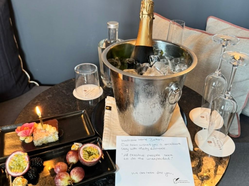 We booked an Executive Superior room for a birthday trip—my best friend and I celebrate back to back, February 14 and 15—and, thanks to Fora Perks, we were upgraded to the Hedy Lamarr Suite Royal. This is the kind of upgrade you simply cannot get booking on your own. When we walked in, the staff had set up a bottle of prosecco on ice, a handwritten welcome note, a fresh fruit tray, and a little birthday cake with a candle. Two staff members delivered it personally. The note quoted Hedy Lamarr herself—”All creative people seek to do the unexpected.”—and it was signed "Artisans of Memories," which is what this hotel calls their team. That set the tone for the entire stay.
