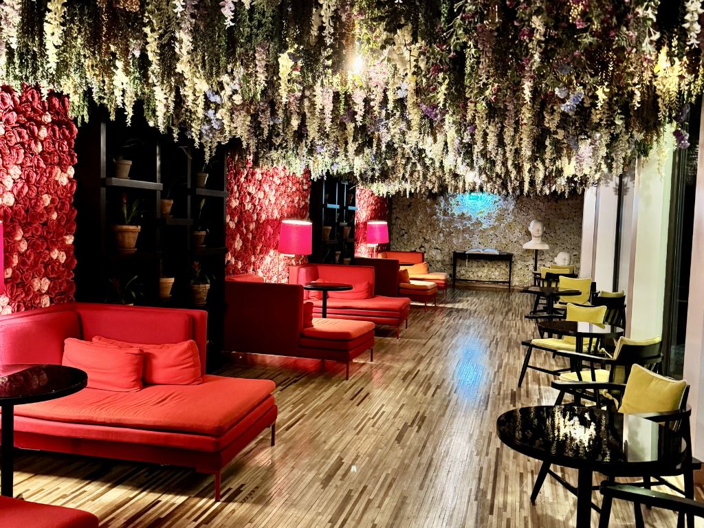 The art here isn’t decorative—it’s the architecture of the experience. Jorge Curval, a Portuguese visual artist, painted the works that line the rooms and main staircase, and also created the iron sculptures on the hotel’s facade. The interiors are a collaboration between Isabel Sá Nogueira, Nano Design, and a roster of Portuguese designers responsible for everything from the custom lighting to the furniture. The common spaces—especially the Sala das Flores with its suspended flower ceiling and red velvet seating—are deliberately provocative, rooted in what the hotel calls Portugalidade: a bold, unapologetic expression of Portuguese creative identity. The property also holds a Michelin Key, which speaks to the level of intention behind every detail. For someone with my background in art history, it’s rare to walk through a hotel and feel like the design deserves the same attention as the destination outside.