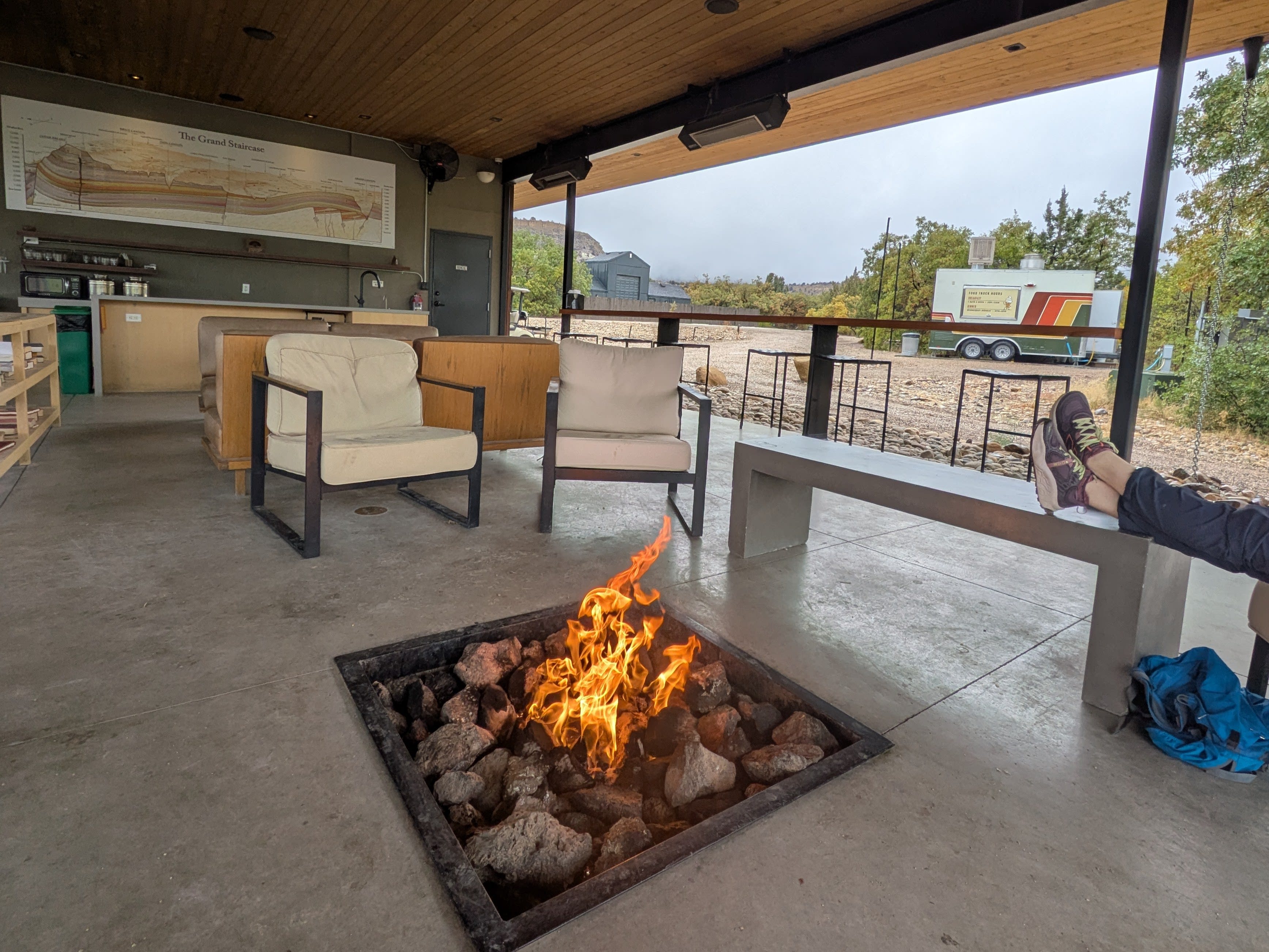 I traveled by camper van during this trip and sought a comfy stopover for a few nights to rest and clean up between my national park visits. Luckily for me, I was able to snag one of Ofland Escalante’s campsites at the last minute. I checked in at the hotel’s main building, where the host gave me an easy-to-follow map and guide to the property grounds. I purchased a sweet snack and a yuzu kombucha from the on-site general store, parked the van at the lovely wooded campsite around the corner, then plopped myself at the lodge area—a covered outdoor patio with seating, gas fireplaces, lending books, coffee, tea, and a view. I knew I had hiking routes to plan, but I was more than content taking in the scene for the entire evening.