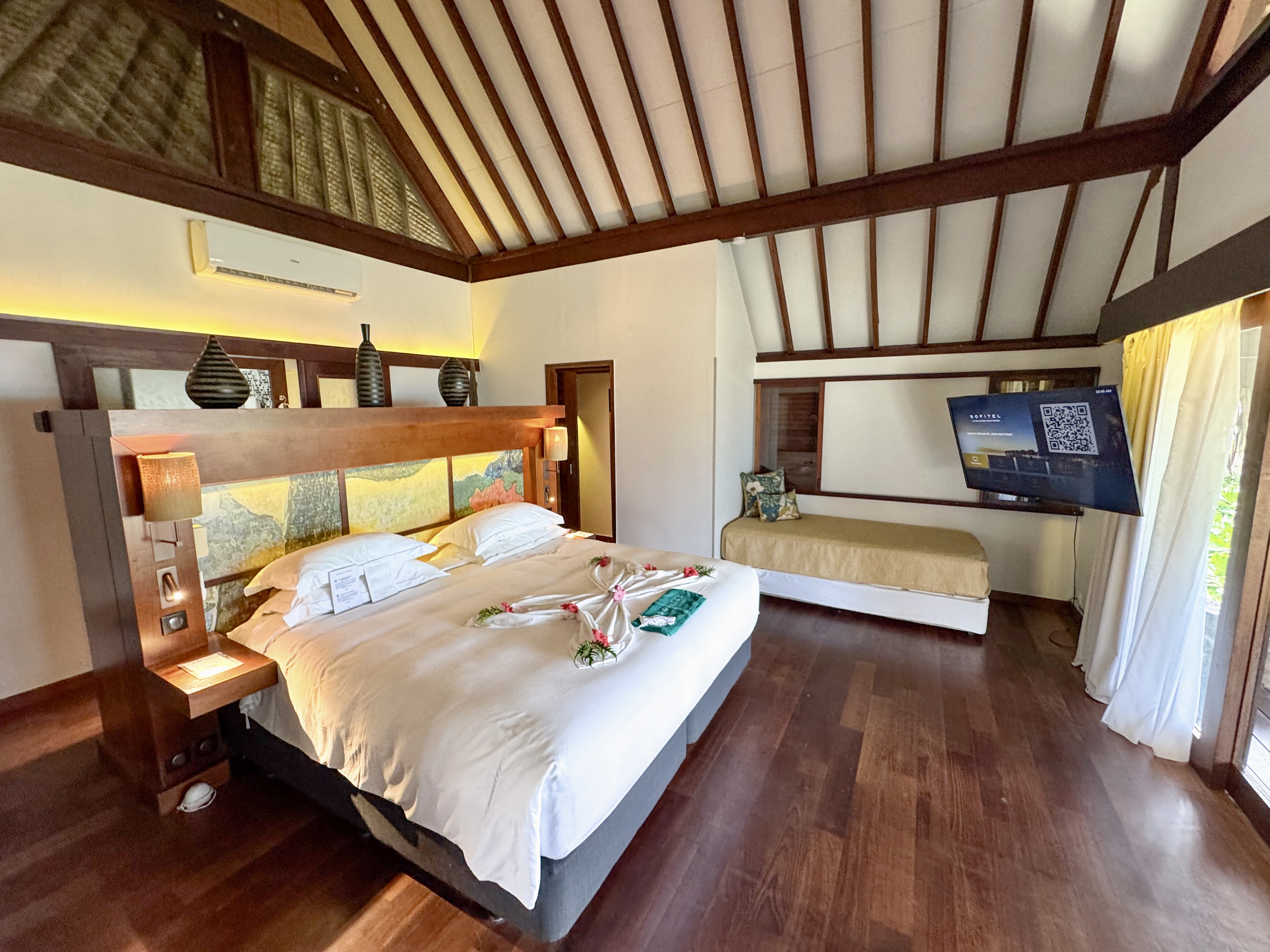 When selecting your room type at the Sofitel, there is one thing to consider: proximity to the private beach, activities center, and beach bar. The hotel is separated by the overwater bungalows: One side is considered oceanfront/oceanview (no beach) and the other is beachfront/view. The Luxury Garden View Bungalows sit further back and have no view of the ocean or the beach. The Superior Bungalows have an ocean view with no beach access (you would have to walk across the property). The other Luxury Bungalows are classified as either Beachfront or Beach View, and these are the ones I recommend if you don’t want overwater. They are not only close to the beach bar, but also the water activity center (where you get snorkel gear, paddle boards, etc.), and the restaurants.