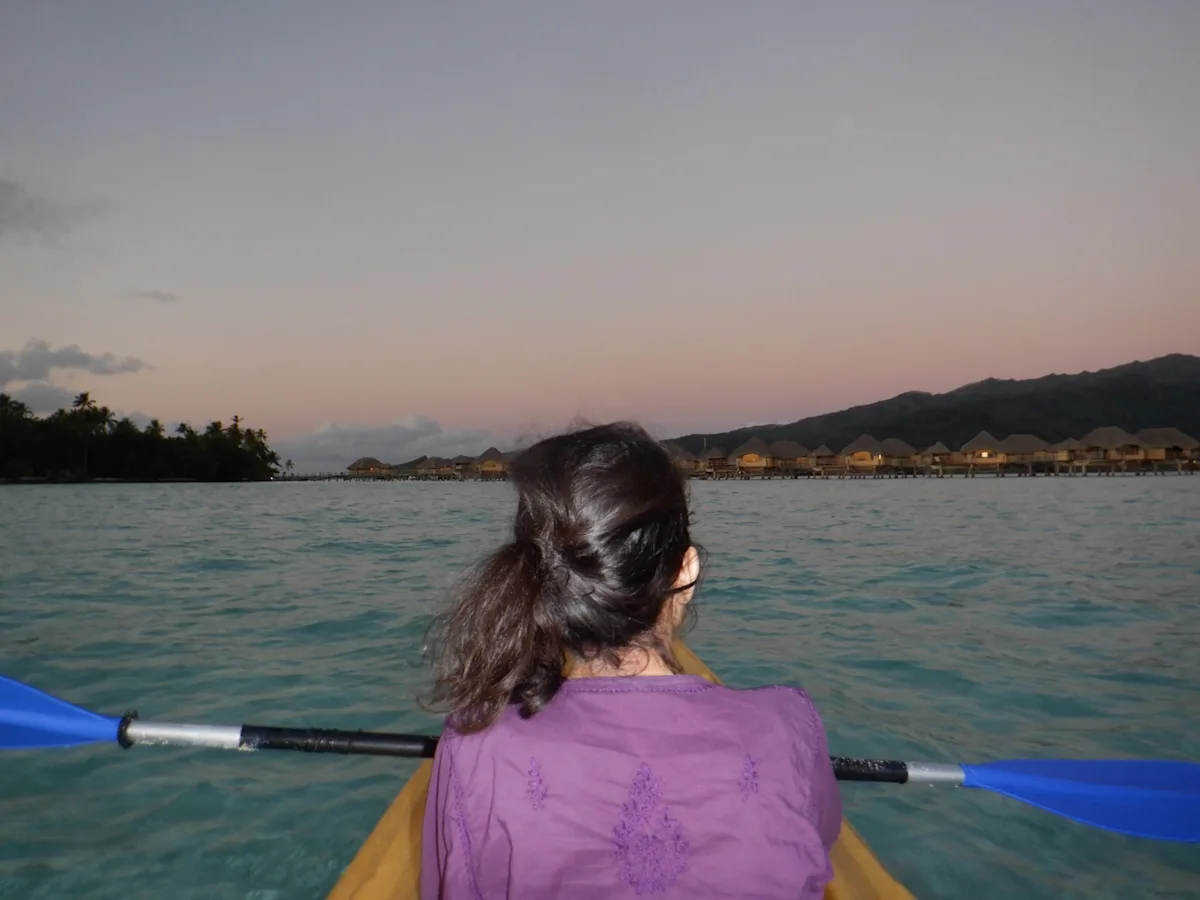 In the evenings, after snorkeling or swimming, we would take a kayak ride just before the sunset. With a view of magnificent Bora Bora every day. A vista that redefines the meaning of breathtaking, with its majestic cliffs adorned with lush vegetation.