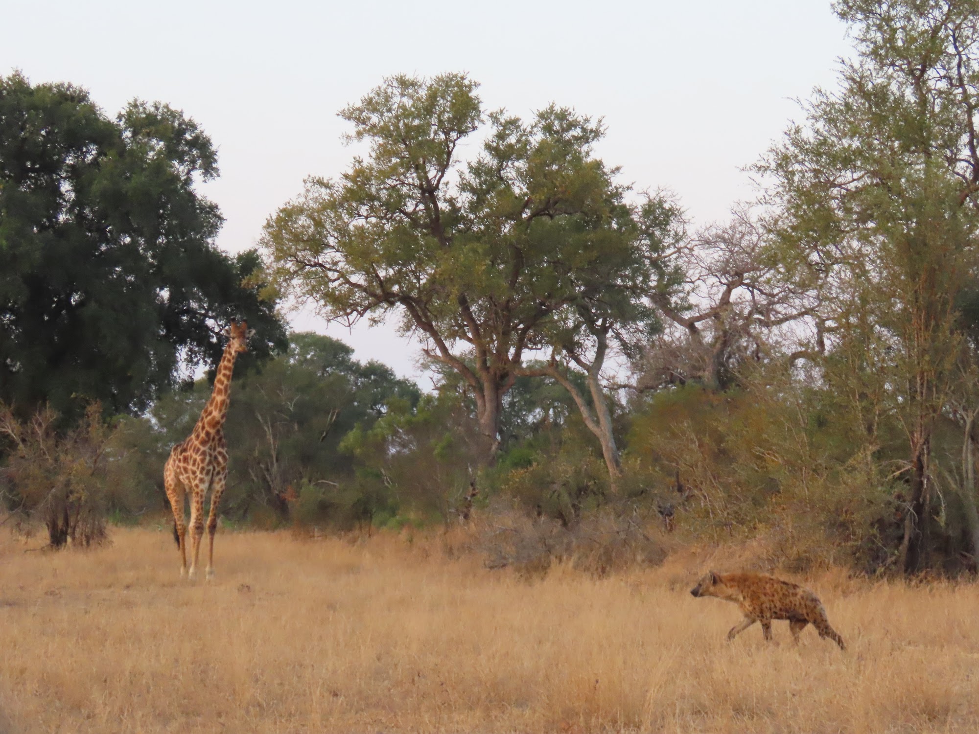 A hyena walks past a giraffe at dusk